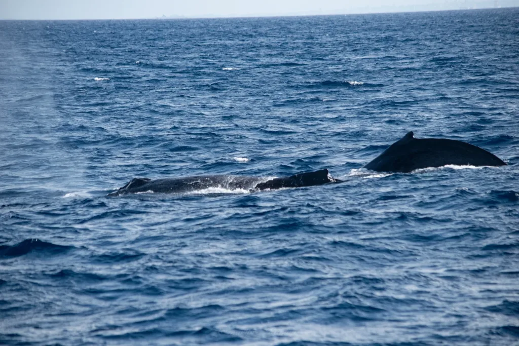 朝一番に2頭の鯨とスイム出来き好スタート!その後また1頭に出会えアプローチをしているといつの間にか2頭に?!