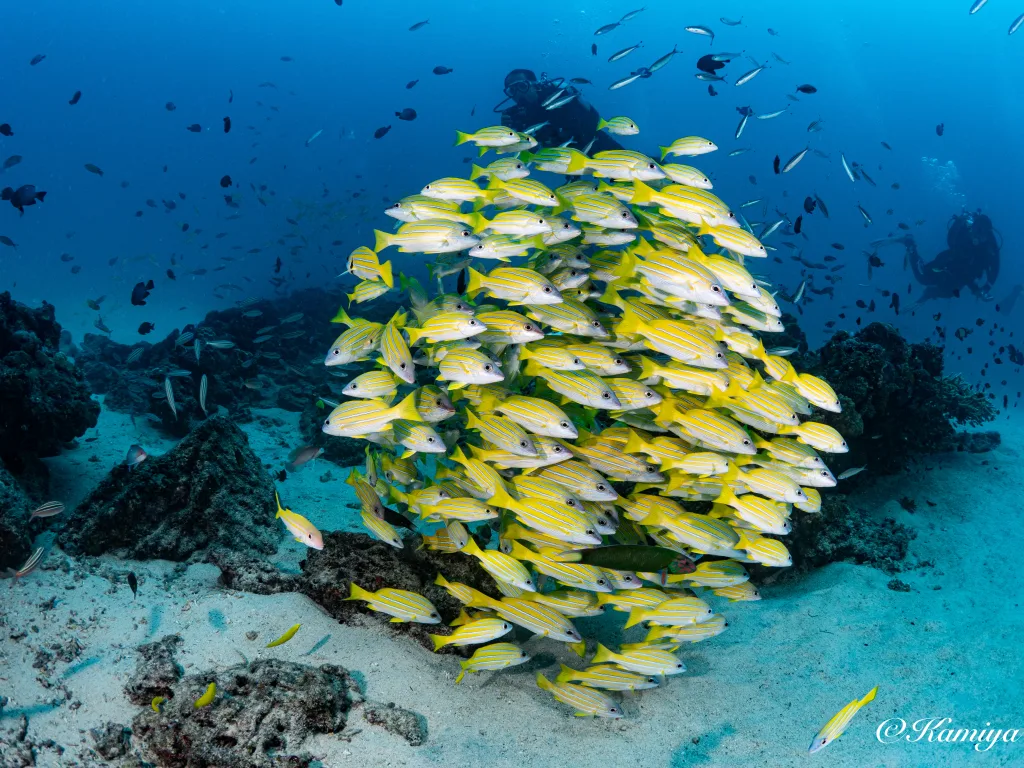 砂地にヨスジの群れやでっかいハナミノカサゴとスカシの群れワイド撮影が楽しいポイントでした!