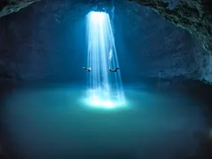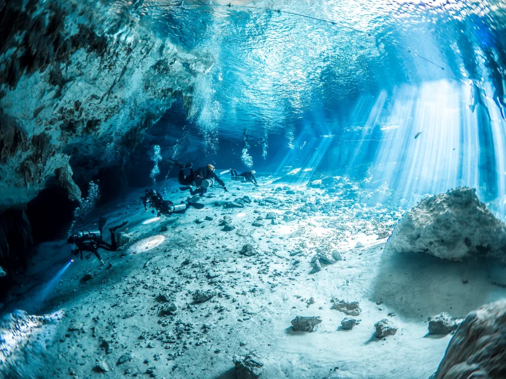 ダイバー憧れの地「メキシコセノーテ」。蒼く澄みきった淡水は驚くほどの透明度で、水中に届く陽射しはまさに光のカーテンであり、ステンドグラスのような神秘的な空間を創り出している。