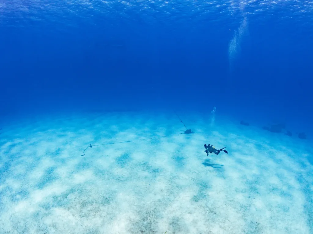 普段も透明度の高い沖縄の海でガイドをしていますが、100m先まで見えているように思うほどの美しい海でした。白砂が雲海のようで、ダイバーが澄んだ青い空を飛んでいるようでした。