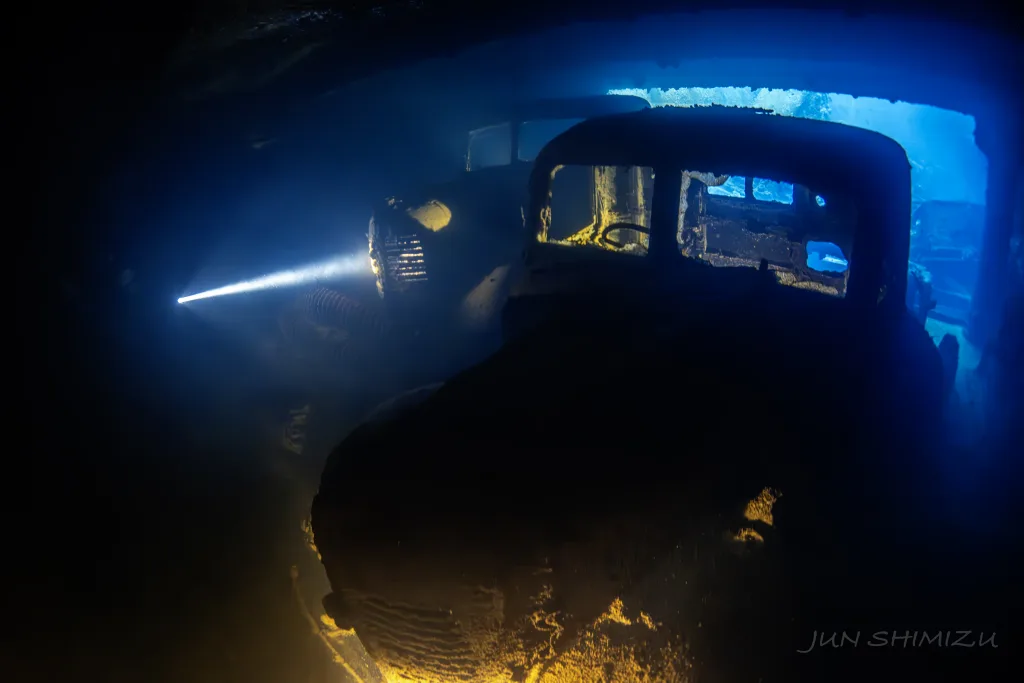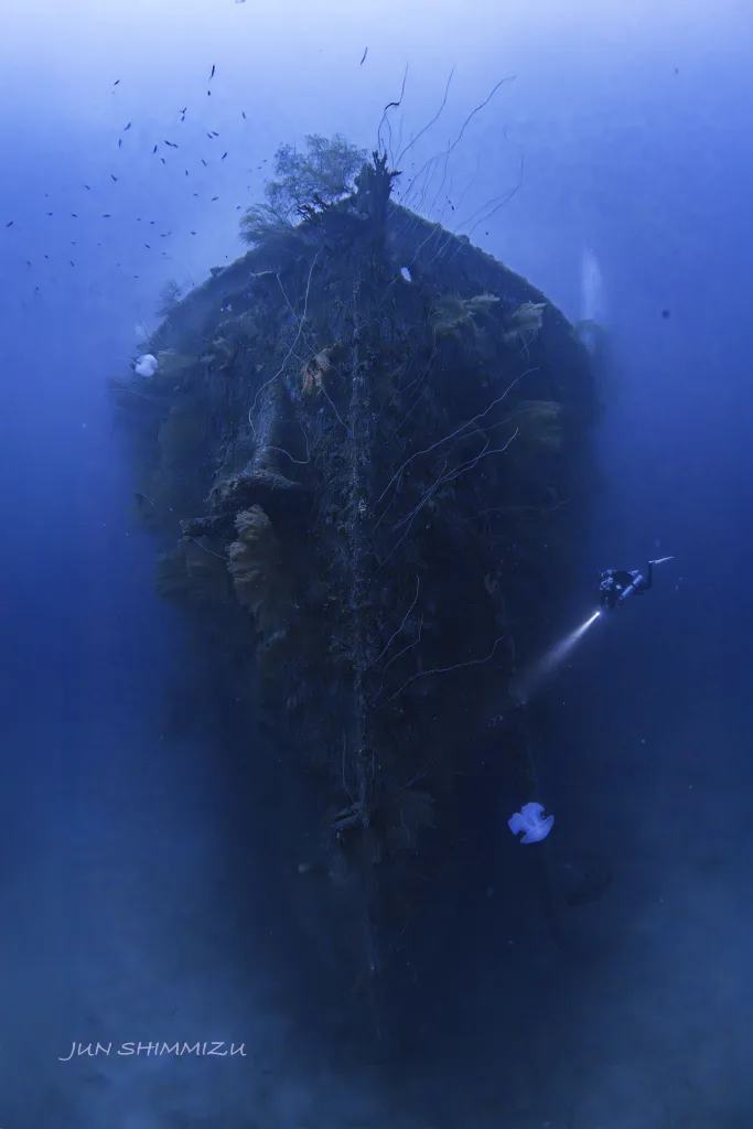 1944年2月17-18日。トラック島空襲(Operation Hailstone)では40隻もの艦船が沈められたことから、その後”海の墓場”とも呼ばれました。多くの船はスクーバダイビングでその姿を見れる水深に眠っています。全体的にその水深は深くディープダイビングの特別な講習を積み上げて参加される方がゆっくりと撮影が楽しめるということで、「テクニカルダイビングで撮影を楽しむ」が今回のツアーのキーになっています。