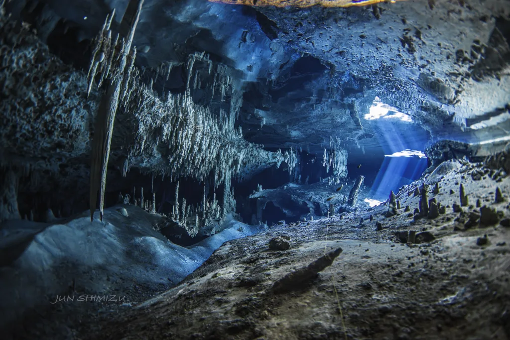 TGシリーズ、デジタル一眼レフカメラ、またはご希望の撮影機材をご持参ください。アクションカメラも歓迎いたします。スポット光タイプの水中ライトをご持参ください。外部ストロボまたは光源として使用するライトは使用いたしません。自然光を用いて撮影を行います。ワンダイブ毎に魅力的な作品を撮影するための撮影データ、撮影位置、水深、シャッターチャンスなどを紹介しながら、十分なブリーフィングを実施いたします。エキジット後にセルフチェックを行い、次のセノーテに活かせるアドバイスを提供いたします。1日の終わりに清水が撮影した作品を鑑賞いただき、翌日の作品撮影を考慮してフィードバックを生かせるよう配慮します。一日中セノーテ撮影に没頭できる特別な撮影ツアーです。