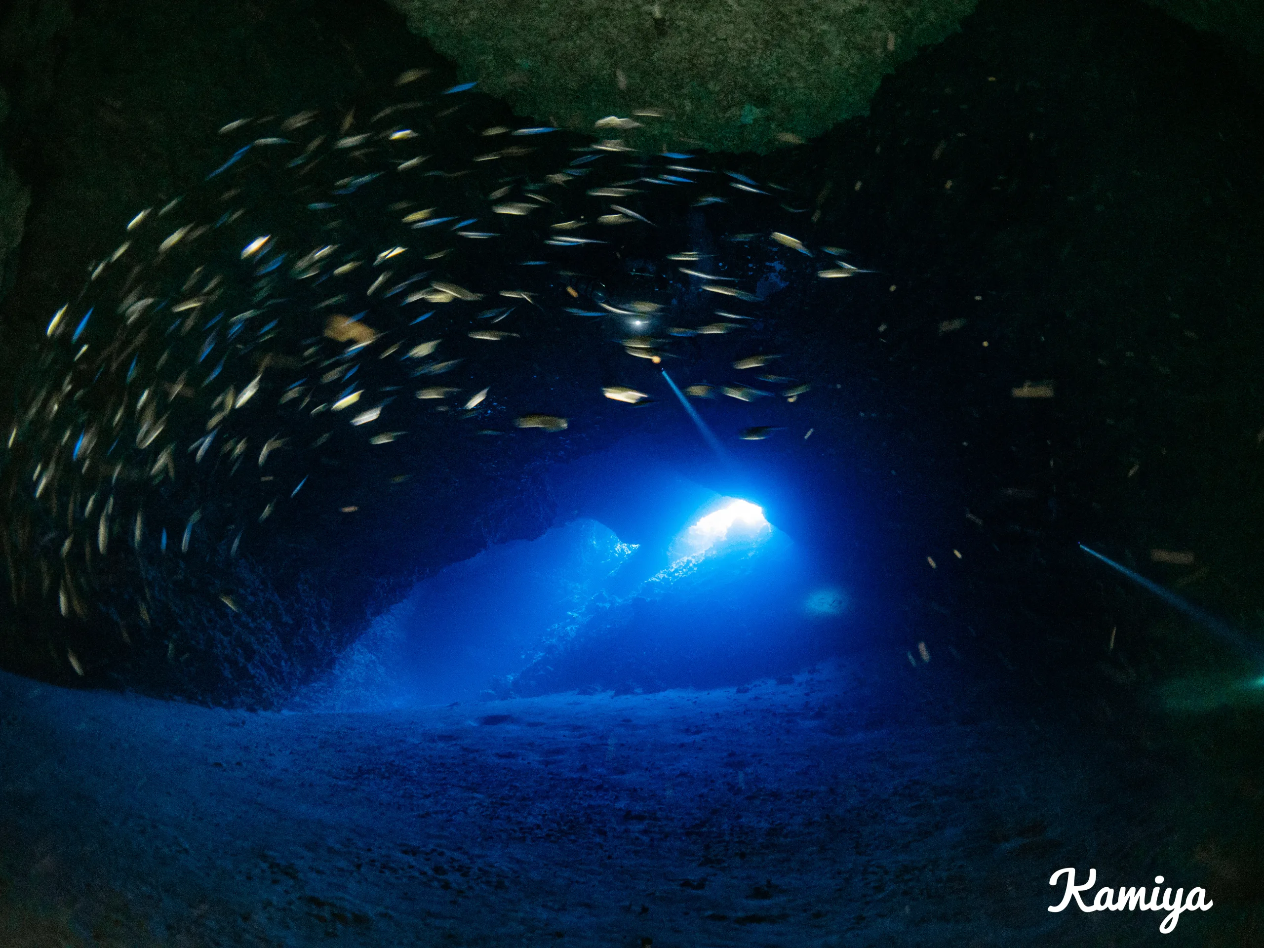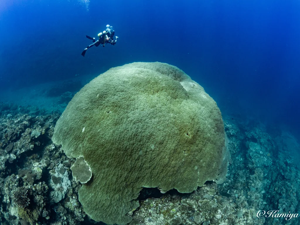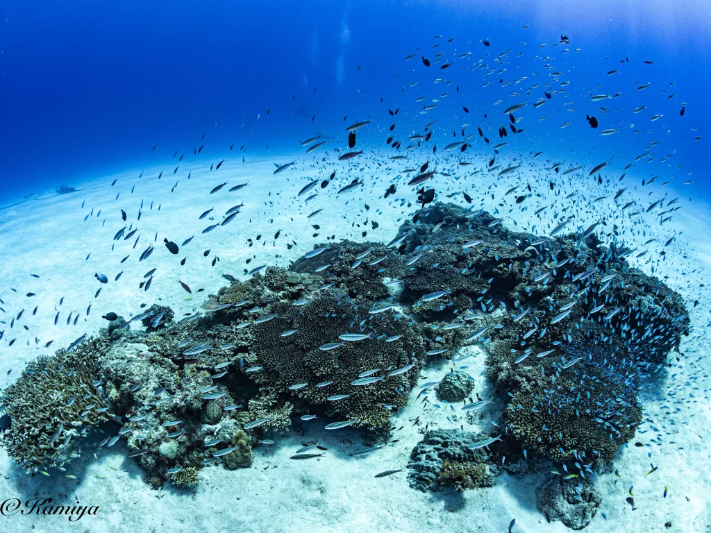 島の北側は地形ポイントが多く、洞窟や光のよく入るクレパス、約400年以上生きてるとされるコブハマサンゴなどダイナミックな地形ダイブが出来ます。南側は、真っ白な砂地帯に魚がいっぱい居る根がポツポツとありワイド撮影がとても楽しい島です。